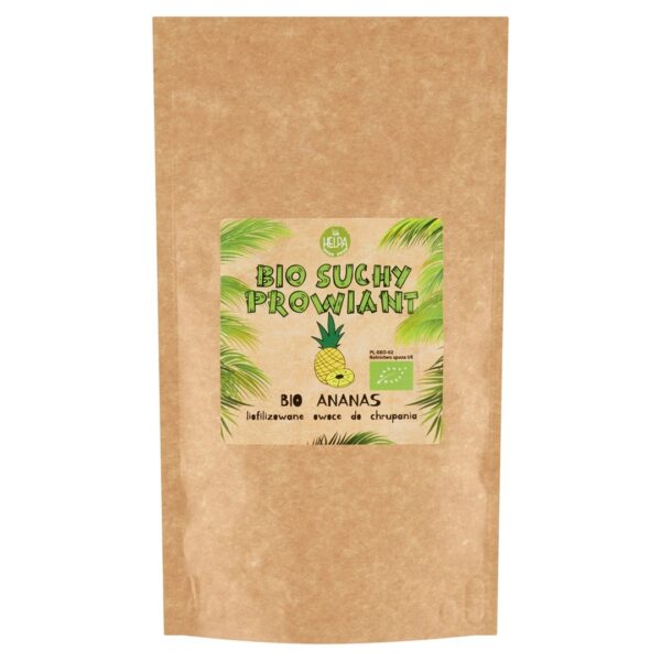 Suchy Prowiant Ananas Helpa BIO to liofilizowane cząstki ananasa, w wygodnej zamykanej saszetce. Chrupiące i aromatyczne owoce to najlepszy wybór, gdy chcemy sięgnąć po zdrową i pyszną przekąskę. Ananas jest świetnym wyborem dla tych, którzy lubią słodkie przekąski, lecz dbają o zdrowie.